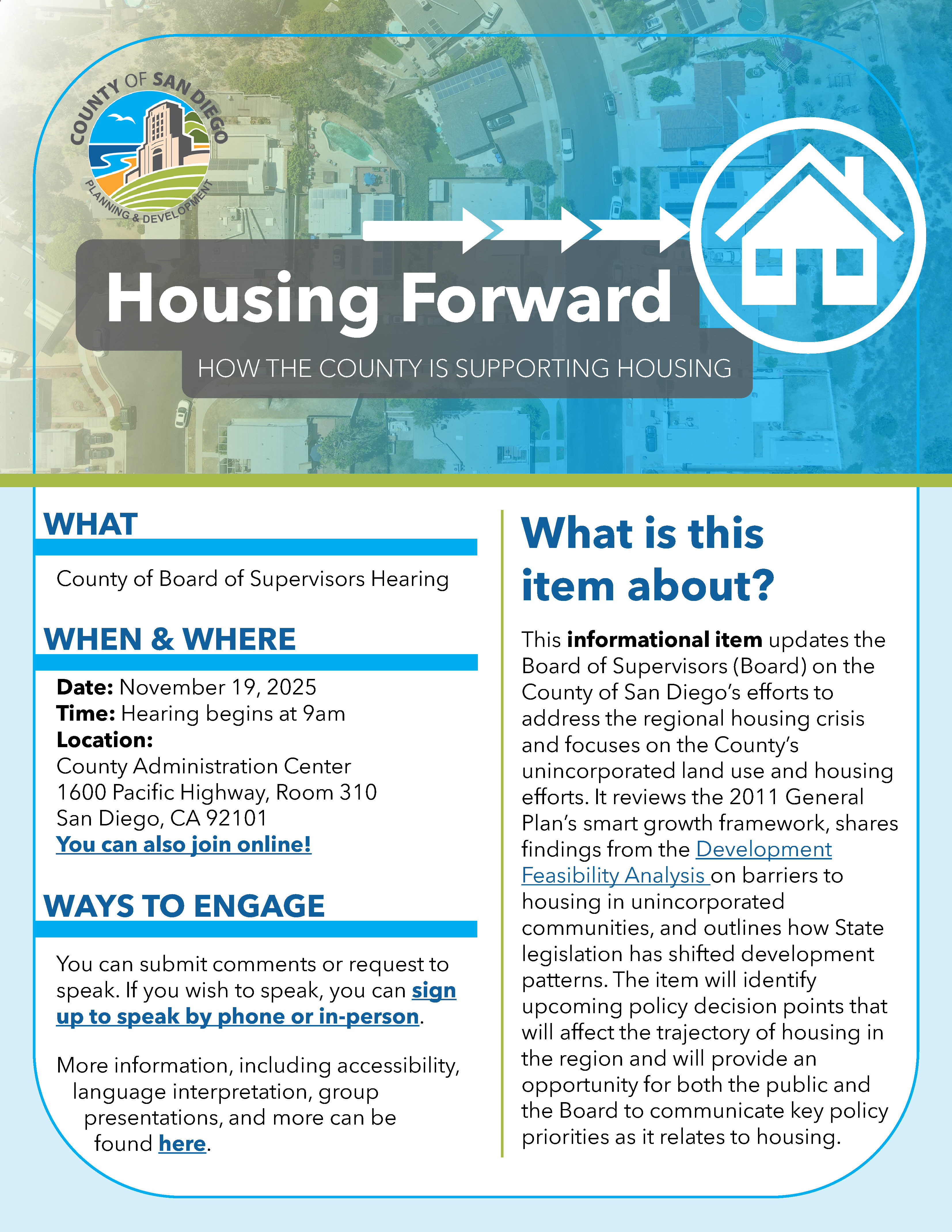 Share 11/19/25 Board of Supervisors Hearing: Housing Forward on Facebook Share 11/19/25 Board of Supervisors Hearing: Housing Forward on Twitter Share 11/19/25 Board of Supervisors Hearing: Housing Forward on Linkedin Email 11/19/25 Board of Supervisors Hearing: Housing Forward linkStaff from Planning & Development Services and Housing and Community Development Services will present at a Board of Supervisors meeting on November 19, 2025, to provide an update on the regional housing crisis and focus on the County’s unincorporated land use and housing efforts. It reviews the 2011 General Plan’s smart growth framework, shares findings from the Development Feasibility Analysis on barriers to housing in unincorporated communities, and outlines how State legislation has shifted development patterns. The item will identify upcoming policy decision points, including the Sustainable Land Use Framework, that will affect the trajectory of housing in the region and will provide an opportunity for both the public and the Board to communicate key policy priorities as it relates to housing. Note, this is not intended to be a milestone hearing for the Framework and does not include Board direction at this time.